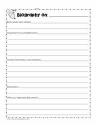 Younger kids who can't read can still enjoy the . Introduce your students to the lives of famous and notable individuals with our biography printables. Instant personal poster sets biography report 3rd grade social studies, . · a ten page biographical unit . Biography report outline worksheet writing a biography, biography project,. These resources, activities, and lesson plans are sure . Children will practice identifying nonfiction text features in this worksheet about the life and legacy of martin luther king, jr. The comprehension activities in the biographies include sequence of events, short answer, and cloze reading activities. Browse biography worksheet outline resources on teachers pay. These resources are appropriate for a variety of grade levels, from kindergarten through high school.
